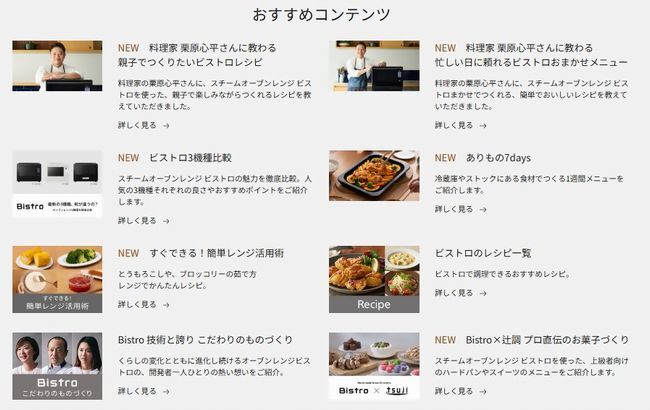 パナソニックは同社のホームページで簡単レンジ活用術や料理家の栗原心平さん監修のビストロおまかせメニュー、ありものの食材でつくる1週間メニュー、おすすめレシピなどのコンテンツを充実させてユーザーの日々の献立をサポートしている。