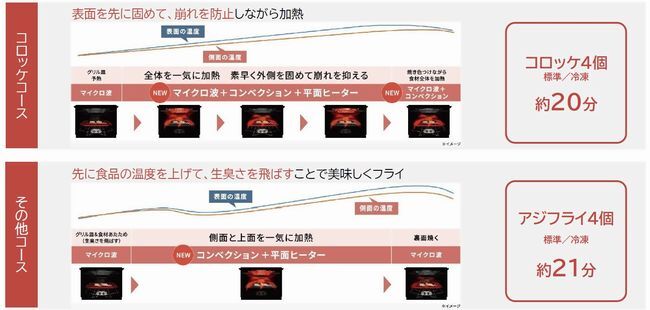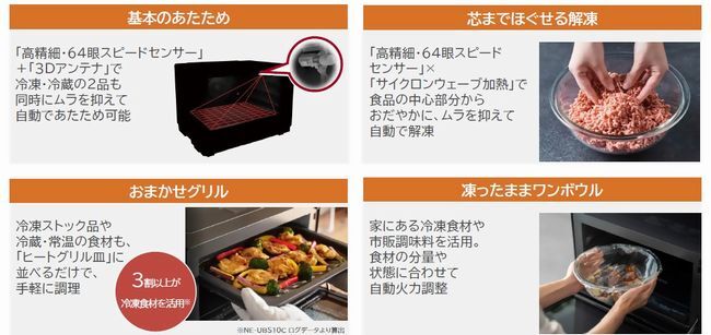 冷凍食品の利用増に対してパナソニックでは、冷凍食品に対応する機能を進化させてきた。例えば「高精細・64眼スピードセンサー」は冷凍食品を自動であたため、解凍時は「サイクロンウェーブ加熱」でムラなく芯までほぐせる、などである。