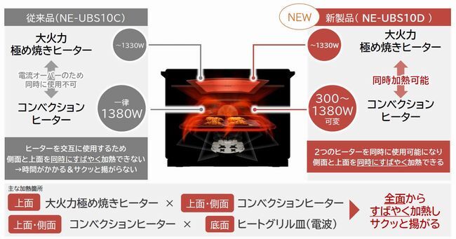 三つの熱源は前機種でも搭載していたが、コンベクションヒーターは一律1380Wで、その電力の大きさからグリルヒーターとの同時加熱ができなかった。最新機種のUBS10DとBS9Dは、コンベクションヒーターの消費電力を300~1380Wに可変することで、同時使用が可能となったと同社では説明する。