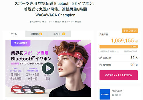 Richgoは、クラウドファンディングサイト「GREEN FUNDING」で展開しているスポーツイヤホン「WAGAWAGA Champion」がクラウドファンディング開始から10日で支援総額100万円を突破した。