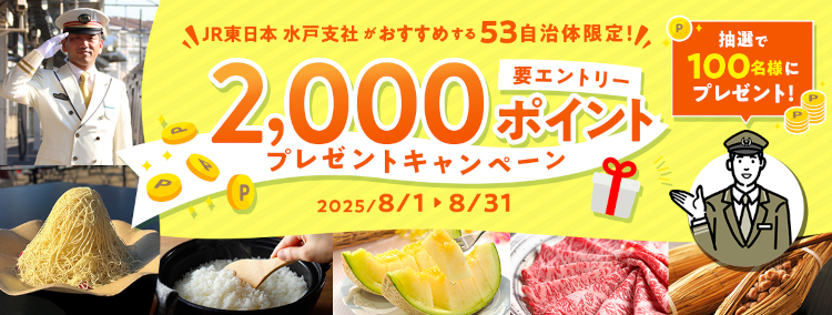 今年8月1~30日の期間には、JR東日本水戸支社がおすすめする53自治体への寄付限定で「JRE POINT が当たる!ふるさと納税キャンペーン」を開催。期間中、エントリーの上、ふるさと納税1万円につき1口として応募でき、抽選で100人に最大2000ポイントが当たります。
