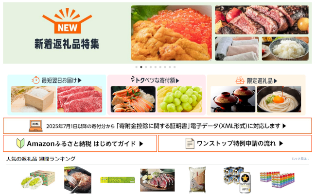 Amazon ふるさと納税は、24年12月にスタートしたAmazonの新サービスです。楽天ふるさと納税と同様、Amazon.co.jpの通常の買い物と同じ感覚で寄付できます。Amazonふるさと納税のみ手に入る限定返礼品も用意しており、Amazonの配送網を利用するので、一部の返礼品は最短で翌日に受け取り可能です。デメリットとして、サービス開始当初は、確定申告時に手続きの負担を軽減する「寄付金控除に関する証明書(XMLファイル)」の発行には対応していませんでしたが、25年7月1日以降の寄付分から対応しました。ワンストップ特例制度を利用せず、確定申告する場合は、このXMLファイルを発行できるふるさと納税サイトの利用がおすすめです。