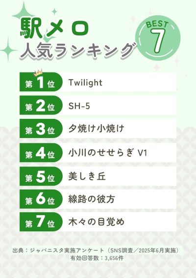 ジャパニスタは8月13日に、公式SNSにて実施した「好きな駅メロ」アンケートの集計結果に基づく、人気駅メロランキングTOP7を発表した。同調査は6月に行われ、3656件の有効回答を得ている。