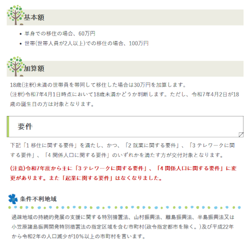 例えば、埼玉県飯能市の場合、移住支援金は100万円ですが、帯同する18歳未満の子どもへの加算額は1人につき30万円と上限額より低いです。また、テレワークの要件は25年度から、いわゆるフルリモートのみに制限されました。