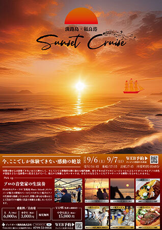 9月6日・7日ともに、開催場所は兵庫県南あわじ市福良港(道の駅福良)で、受付開始は16時45分、VIP席乗船は17時、自由席乗船は17時15分、出航時間は17時45分、入航時間は18時45分。定員は100名(先着順)。
