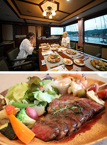 VIP席にはシェフによるライブキッチンが用意され、目の前の鉄板で香ばしく焼き上げられるステーキなど、できたての温かい料理を、夕日のもとで楽しめる。