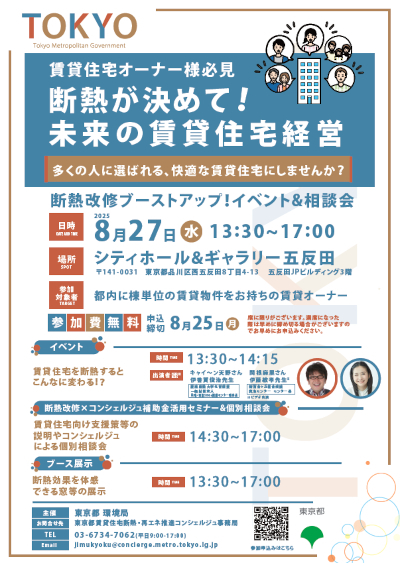 同イベントは、都内に棟単位で賃貸住宅を所有する賃貸住宅オーナーを対象に開催され、当日の13時30分~14時15分には「断熱でここまで変わる!賃貸暮らしの新常識~健康・お財布・地球にやさしい都の賃貸革命~」と題して、断熱性能が入居者の健康や光熱費に及ぼす驚くべき影響や、都に登録された「コンシェルジュ」によるオーナーへの支援内容などを紹介する、スペシャルトークステージを実施する。同ステージの登壇者は、タレントの天野ひろゆきさん、同じくタレントの関根麻里さん、慶應義塾大学名誉教授であり住宅・建築SDGs推進センターの理事長も務める伊香賀俊治さん、新百合ヶ丘総合病院救急センターのセンター長である伊藤敏孝さん(ビデオ出演を予定)の4名。