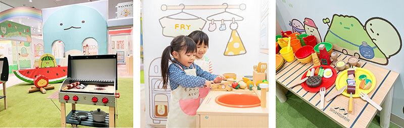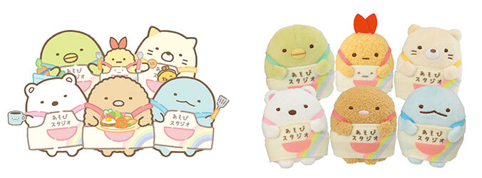 さらに、あそびスタジオ限定てのりぬいぐるみには「えびふらいのしっぽ」が新たに仲間入りする。「えびふらいのしっぽ」はオリジナルアートと同様に、デザイン違いのエプロンを着用しており、施設内ではすみっコたちとおそろいのエプロンを着て、ごっこ遊びを楽しめる。