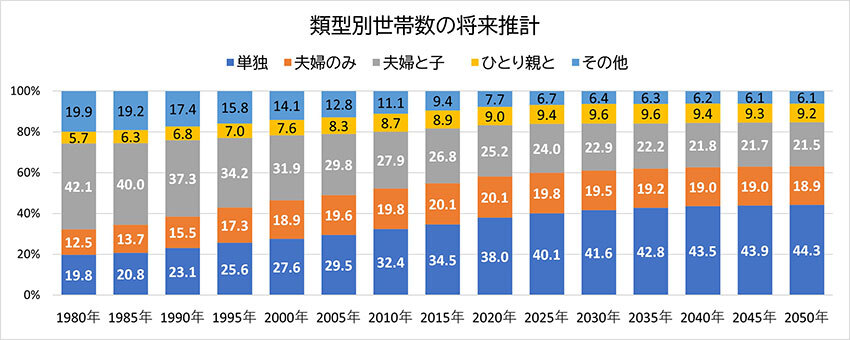 今後、世帯数は2030年にピークを迎えてその後は減少に転じるとみられ、単身世帯も世帯数は2036年にピークを迎えるが、全世帯に占める割合は上昇を続け、2050年には全世帯の44.3%が単身世帯になると予想されている。