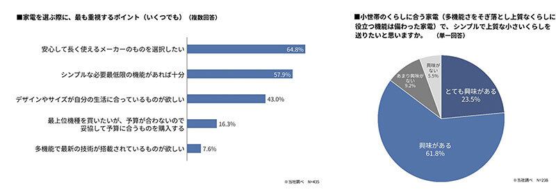 さらに同社が1人もしくは2人暮らしの18歳以上の男女に対して25年6月25日~7月2日に実施したインターネット調査では、『小世帯の暮らしに合う家電で、シンプルで上質な小さい暮らしを送りたいと思いますか』との問いに、約85.3%が「興味がある」と回答した。