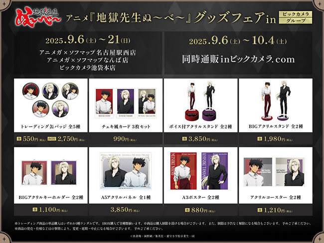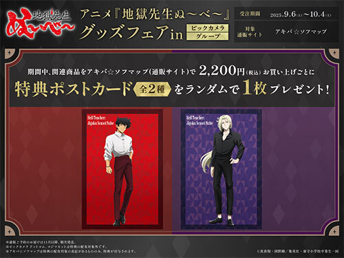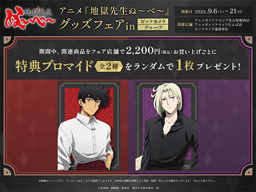 ビックカメラ池袋本店(東京都豊島区)、アニメガ×ソフマップ名古屋駅西店(愛知県名古屋市)、アニメガ×ソフマップなんば店(大阪府大阪市)にて9月6~21日の期間、「アニメ『地獄先生ぬ~べ~』グッズフェア in ビックカメラグループ」が開催される。