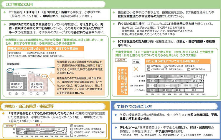 具体的には、Society 5.0時代(政府が提唱するサイバー空間とフィジカル空間を高度に融合させた社会構想)の到来を見据え、全ての子どもたちが公正かつ最適化されたデジタル環境を享受できるよう、「1人1台端末」と「高速大容量の通信ネットワーク」の整備に注力してきた。大規模な補正予算と財政支援によってトップダウンで進められたこともあり、文部科学省の最新調査では、義務教育段階(小中学校)に加え、高等学校においても「1人1台端末」の環境がほぼ整ったと報告している。