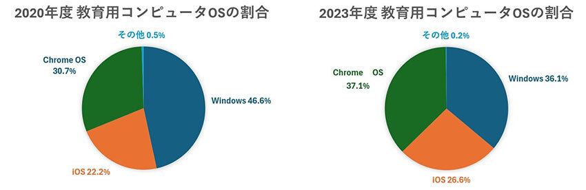 端末更新については、OSシェアでも興味深い変化がみられる。政府の「学校における教育の情報化の実態等に関する調査」によれば、20年度では46.6%を占めていたマイクロソフトのWindowsが23年度では36.1%と大きくシェアを減らした一方、グーグルのChromeが30.7%から37.1%、アップルのiOSが22.2%から26.6%と増加している。