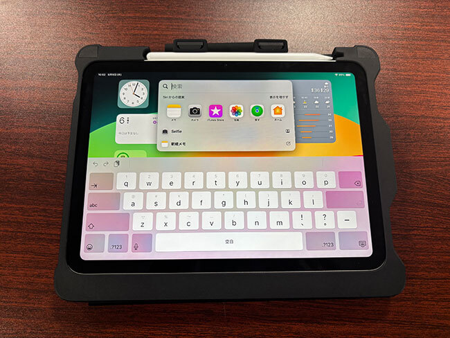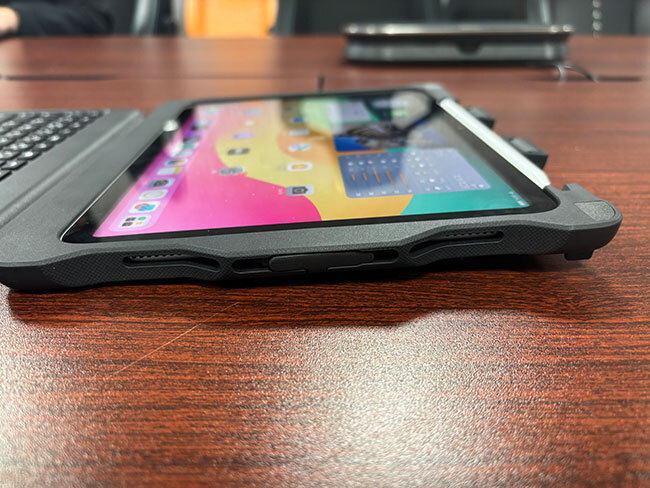 同様に具体的なシーンを想定して工夫されているのが、ケース上部に備えられているスタイラスペンを収納するホルダーだ。NEXT GIGAではスタイラスペンが必須となっており、各自治体は調達する必要があるが、予算の兼ね合いで純正のApple Pencilを用意するのは難しい。STM Duxのペンホルダーを固定するゴムリングは取り外しできる設計になっており、純正品以外のタッチペンにも幅広く対応し、ペンを保持することが可能だ。