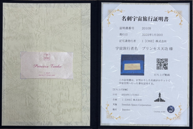 第1回打ち上げ時のプリンセス天功様_名刺宇宙旅行証明書