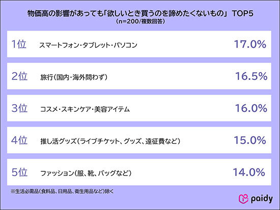物価高を感じている人は95.0%(とても感じる60.5%・まあまあ感じる34.5%)とほとんどを占める結果に。そのなかでも買うのを諦めたくないものを尋ねたところ、「生活必需品」を除いて、1位「スマートフォン・タブレット・パソコン」(17.0%)、2位「旅行(国内・海外問わず)」(16.5%)、3位「コスメ・美容アイテム」(16.0%)がランクインした。友達とのやり取り、授業や課題、情報チェックまで、毎日を支えるスマホやPCは、今やなくてはならない存在。“第二の生活必需品”と言える。
