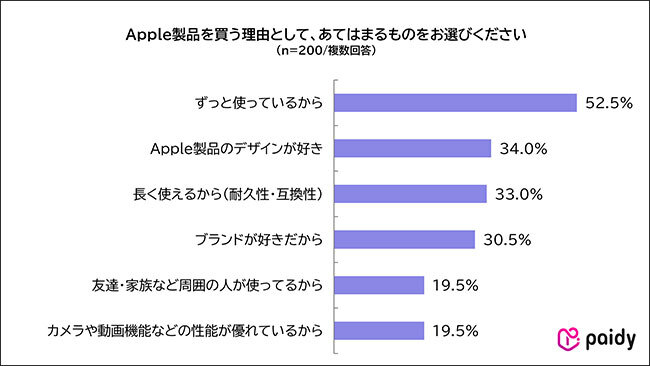 調査では、Appleユーザーに「Apple製品を使い続ける理由」を聞いたところ、最も多かったのは「ずっと使っているから」(52.5%)。次いで「デザインが好き」(34.0%)、「耐久性や互換性の観点から、長く使えるから」(33.0%)と続いた。