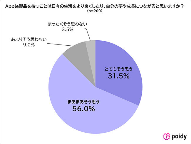 また、「Apple製品を持つことは日々の生活をより良くしたり、自分の夢や成長につながる」と感じている人が、87.5%にものぼることが明らかになった(とてもそう思う31.5%・まあまあそう思う56.0%)。