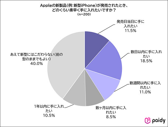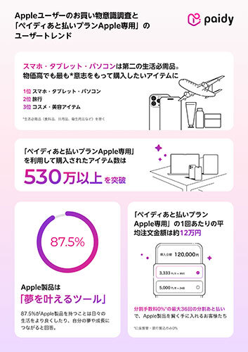 Paidyは、全国のApple製品ファンの18~29歳のZ世代と、30~49歳のミドル層の男女計200人を対象に、購買行動に関する調査を実施した。また、同社が提供する「ペイディあと払いプランApple専用」の利用傾向データを公開した。