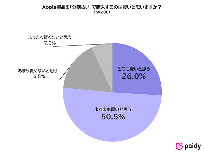 Apple製品の買い物に対する支払い意識を調査したところ、分割払いを「賢い」と捉えている人が76.5%にのぼり、多くの人にとって高価なApple製品の購入では、分割払いという購入手段がポジティブに受け入れられていることがわかった。