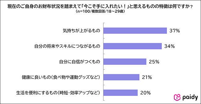 Z世代が「今こそ手に入れたい!」と感じるものを調査したところ、トップ3は「気持ちが上がるもの」(37%)、「自分の将来やスキルにつながるもの」(34%)、「自分に自信がつくもの」(25%)となった。心の充実や自己肯定感を高めるアイテムへの関心の高さがうかがえる。