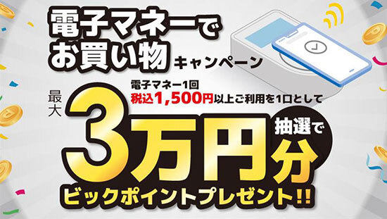 キャンペーン対象の電子マネーは、iD、nanaco、QUICPay、楽天Edy、WAON、交通系IC(Kitaca・Suica・PASMO・TOICA・manaca・ICOCA・SUGOCA・nimoca・はやかけん)。対象店舗は、ビックカメラ各店、AirBicCamera各店。コジマ×ビックカメラ、ビックカメラアウトレット、AirBicCamera中部国際空港セントレア店は対象外となる。当選内容は、1等が「ビックポイント3万円分」(2100人)、2等が「ビックポイント5000円分」(2500人)、3等が「ビックポイント2000円分」(2500人)。