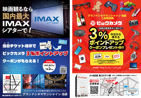 同企画では、グランドシネマサンシャイン池袋での映画鑑賞後に、当日分の映画チケットをビックカメラ池袋本店(東京都豊島区)1階の総合案内カウンターに持参すると、その日からすぐに使える3%ポイントアップクーポンがもらえる。スマートチケットの場合は、スマートフォンの入場画面を提示すればよい。3%ポイントアップクーポンは、指定商品が3%ポイントアップとなり、「ビックカメラ」全店舗(「ビックカメラアウトレット」と「コジマ×ビックカメラ」は除く)で使える。有効期限は12月31日まで。