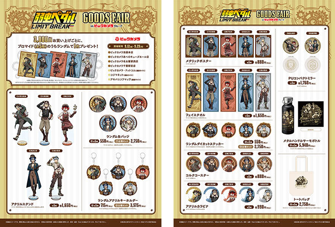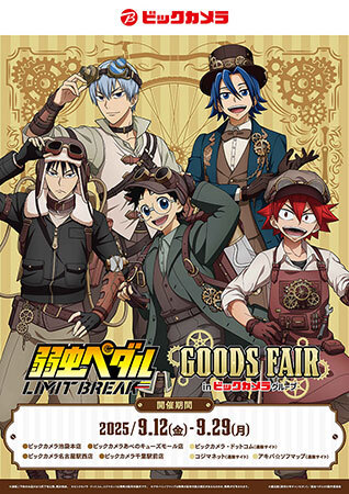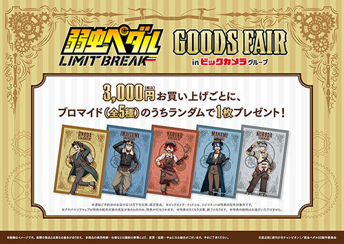 今回開催される「TVアニメ『弱虫ペダル LIMIT BREAK』グッズフェアinビックカメラグループ」では、総北高校から「小野田坂道」「今泉俊輔」「鏑木一差」、箱根学園から「真波山岳」「黒田雪成」の計5キャラクターによる、スチームパンク衣装を着用した等身大パネル展示や、描き下ろし絵を使用した新規グッズの販売が行われる。限定グッズのラインアップは以下の通り。