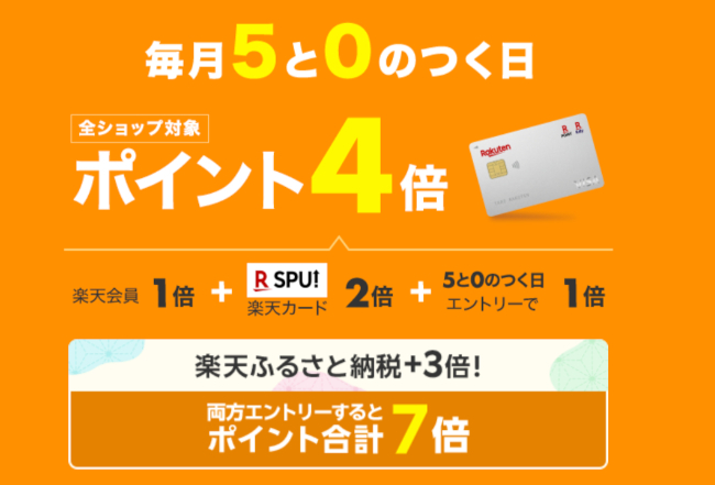 ただし、この特典を受けるには、キャンペーン対象日に特設ページからエントリーすることと、決済方法を楽天カードに指定することが必要です。条件を満たしていない場合はポイントが加算されないため、事前にエントリーを済ませてから買い物を始めましょう。