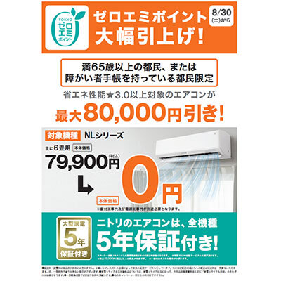 東京都のゼロエミッション行動推進事業「東京ゼロエミポイント」制度では、東京都在住の満65歳以上、または障がい者手帳を持っている人が自宅に省エネエアコンを設置する場合、最大8万円引きになるため、「エコで楽エアコン6畳用」の本体価格(7万9900円)が全額値引きとなり、自己負担なく買い替えられる。さらに、東京都に在住する65歳未満の人でも、製造年から起算して15年以上経過したエアコンからの買い替えなら最大5万円引き、新規購入でも1万円引きで購入できる。