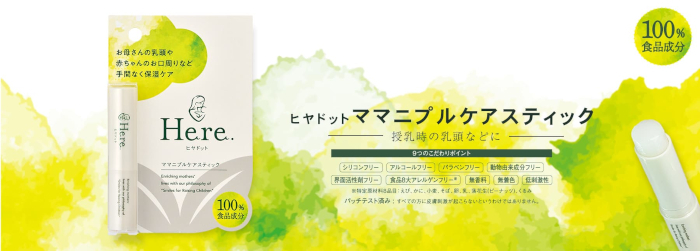 「Here.ママニプルケアスティック」は、授乳期に多い乳頭の乾燥や赤ちゃんの口まわりのカサつきといったデリケートな悩みに寄り添い、忙しい育児の中でも手軽に使えるスティックタイプの保湿ケアアイテム。食品成分だけで構成されており、食品8大アレルゲン(えび、かに、小麦、そば、卵、乳、落花生、くるみ)は一切使用していない。