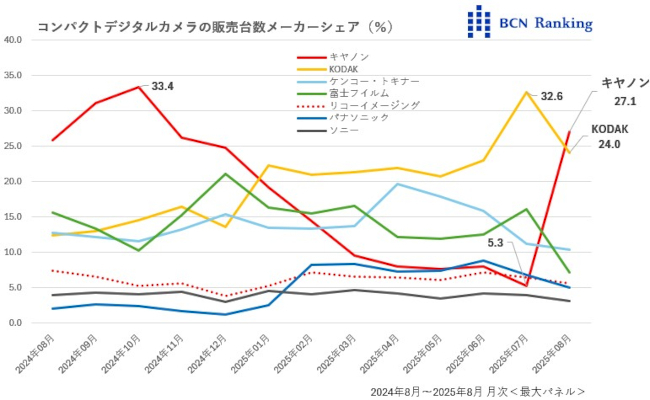 コンパクトデジタルカメラ(コンデジ)でキヤノンのシェアが爆上がりしている。BCNランキングの集計で7月は5.3%と6位に沈んでいた同社だが、8月には27.1%と怒涛の回復。やすやすとトップシェアを奪還した。原動力は8月に受注再開した「PowerShot G7 X Mark III」。7月まで流通在庫のみで細々と販売されていたこのカメラ。8月には、いきなり15.6%のシェアを得てトップに躍り出た。2019年発売で1インチセンサーを搭載。ロングセラーの高級コンデジだ。8月の平均単価(税抜き、以下同)は10万7000円だった。同じく8月に受注を再開した「PowerShot SX740 HS」も8.0%と台数シェアで3位につけ、キヤノンのコンデジシェアを押し上げている。1/2.3型センサー搭載で8月平均単価は6万8000円だった。より高価なPowerShot G7 X Mark IIIの方が倍近く台数が出ており、この点は興味深い。