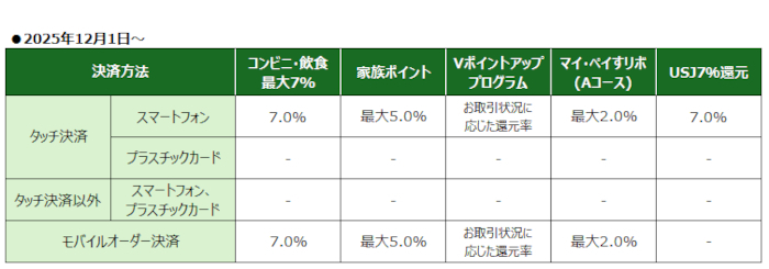 一方、三井住友カード(NL)の「対象のコンビニ・飲食店で最大7%還元!」の店頭決済時のポイント還元率について、12月1日から「スマホのタッチ決済」以外は上乗せなしとする(還元率は通常と同じ)。「Vポイントアッププログラム」「家族プログラム」「マイ・ペイすリボの選べるポイント特典(Aコース)」「ユニバーサル・スタジオ・ジャパンで最大7%還元!」も同様に「スマホのタッチ決済」以外の還元率を見直す。