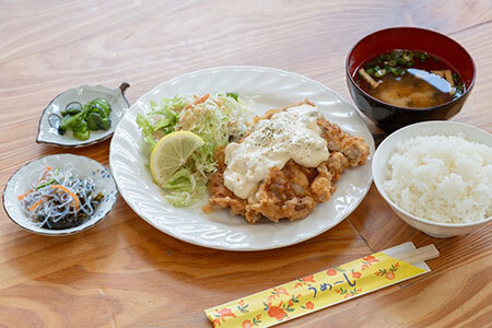こちらのおすすめグルメは、山之口の特産品でもあるしいたけを使った料理です。レストランあじさい館の「しいたけ南蛮定食」は、朝採れの肉厚しいたけに、自家製の和風タルタルソースがたっぷり。満足度の高いメニューです。