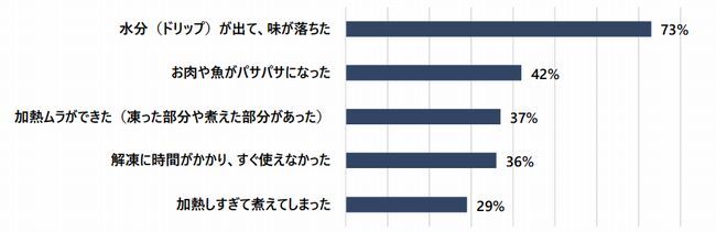 ふるさと納税で届いた冷凍の食材を解凍する際に、失敗したことがあるかを尋ねた質問では、「ある」という回答が約4割に達しており、失敗の内容としては(複数回答)、「水分(ドリップ)が出て味が落ちた」が最多となり、以下「お肉や魚がパサパサになった」「加熱ムラができた」が続いている。