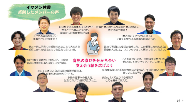 「イクメン休暇」制度の利用者からは、休暇だけでなく今後も積極的に育児へ参画していきたいという想いが感じられる声が寄せられている。