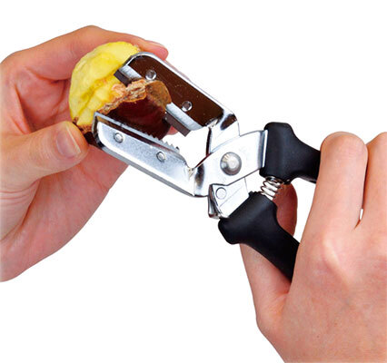ハサミ式の構造で、片方には切れ味の鋭い刃、もう片方には栗をしっかり押さえるギザ刃を搭載しており、握るだけで鬼皮と渋皮を同時に剥けます。そのため、力を入れすぎる必要もなく、効率よくきれいに下処理できます。ソフトグリップ仕様で手に優しく、誰でも扱いやすい構造です。