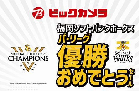 ビックカメラは、福岡ソフトバンクホークスがペナントレースで2年連続の優勝を達成したことを記念し、9月28日から10月10日まで、九州の対象店舗で「福岡ソフトバンクホークス パーソル パ・リーグ優勝おめでとうセール」を開催する。