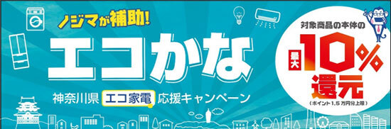 ノジマは、10月1日から11月30日の期間中、神奈川県内のノジマ店舗で、省エネ性能の高いエアコン・冷蔵庫と、節水性能の高いドラム式洗濯機を対象に、1台あたり最大10%還元のノジマポイントを付与する「エコかな」キャンペーンを開催する。