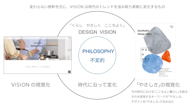 象印では外部のデザイナーとのコラボだけでなく、社内でもデザイン面を強化するため、2022年に『くらし やさしく、ここちよく』というデザインビジョンを策定。同時にこのビジョンを商品に表現していくメソッドとして設定したのが、『やさしさのカタチ』だ。