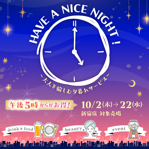 京王百貨店は10月2~22日の期間、平日を中心に17時からのおトクなサービスを展開する「HAVE A NICE NIGHT!」を、京王百貨店 新宿店(東京都新宿区)にて実施している。