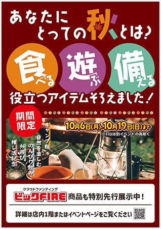 同イベントでは、ビックカメラ池袋本店の販売員が厳選した、秋の「遊び」「備え」「食」をテーマとした商品を用意している。あわせて、クラウドファンディングサービス「CAMPFIRE」との共同企画「ビック FIRE2025」にエントリー中の商品も初展示する。