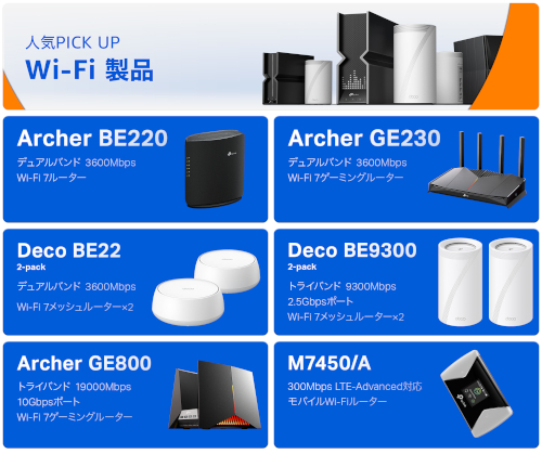 無線LANルーターとしては、10Gbps対応の有線LANポートを搭載したWi-Fi 7ルーター「Archer BE450」、エントリーモデルの「Archer BE220」、ハイエンドゲーミングルーター「Archer GE800」などを、おトクな価格で販売する。
