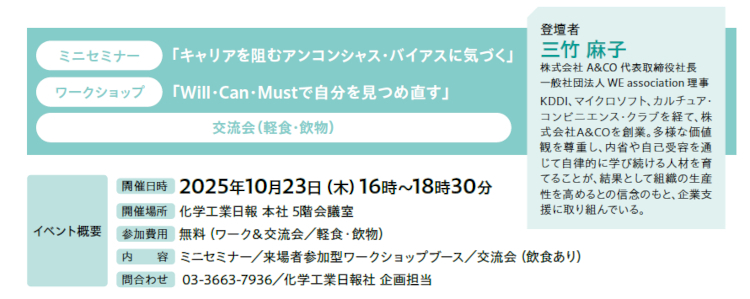 化学工業日報社(東京・中央区)は10月23日の16時~18時30分に、人事・経営企画・人材戦略を担う人を対象に、女性リーダーを育てる職場づくりを考えるワークショップとセミナーを開催する。参加費は無料。場所は同社の東京本社5階の大会議室。定員は先着順で40名。申し込みは同社ホームページのセミナー情報から登録する。