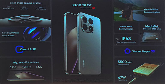 もう一つのモデルは、Xiaomi 15T。15T Proと同じくライカのトリプルカメラを搭載しているが、望遠レンズは15T Proより低い光学2倍。ディスプレーのサイズは15T Proと同じ有機ELの6.83インチだが、リフレッシュレートは120Hzとなっている。バッテリーも15T Proと同じ5500mAhだが、バッテリー切れからフル充電までの時間は約50分である。