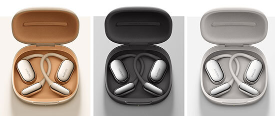 オープンイヤー型完全ワイヤレスイヤホンの新製品はXiaomi OpenWear Stereo Pro。イヤーフックに厚さ0.6mmの超薄型フレキシブル形状記憶チタンワイヤーを内蔵し、外装は液体シリコンで包まれているため、三点支持設計と合わせて長時間でも快適に装着できる。