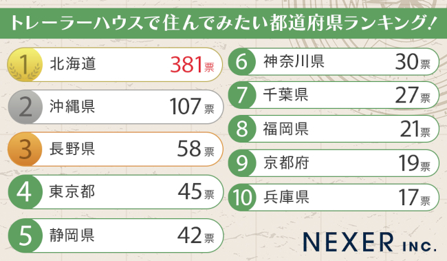 第3位は長野県で、「トレーラーハウスなら、移動可能という点を活かして季節ごとに違った景色を楽しむことができるから」「なんとなく、都会より田舎のイメージがあるから」「風景をしっかり楽しめそうだから」などのコメントが寄せられたという。