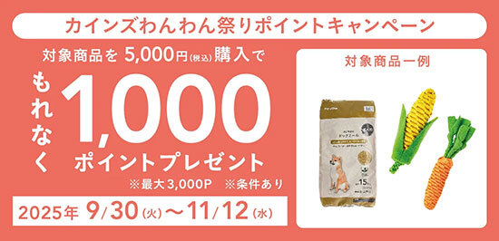 9月30日~11月12日の期間には、「カインズ わんわん祭り ポイントキャンペーン」をカインズアプリ会員限定で開催。同キャンペーンでは、あらかじめエントリーした上で犬用のフード・用品を税込5000円以上購入すると、もれなく1000ポイントが付与される。また、公式オンラインショップ限定で、期間中に購入した対象商品をカインズ わんわん祭り2025終了後の1年間、ポイントが3倍で購入できるキャンペーンも開催されている(付与上限は3000ポイント)。
