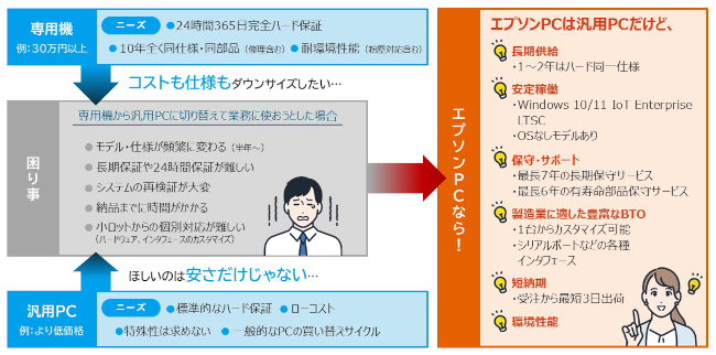 一般的に専用機は高耐久、24時間365日保証といったメリットがある一方で、オーバースペックになりがちだが、エプソンダイレクトが販売するWindows 11/10 IoT Enterprise LTSC搭載PCは、汎用PCながら1~2年は同一仕様で販売されるため、モデル変更の心配が少なく、安定稼働とコスト削減の両立が可能となっている。