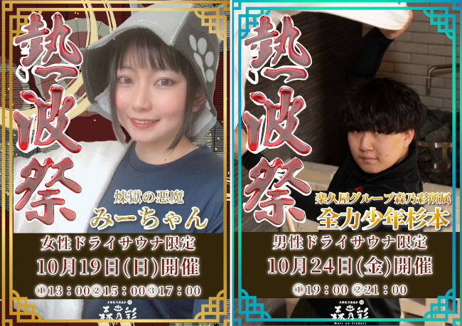 男女ドライサウナでは、無料で参加可能なアウフグースイベントが実施され、10月19日の13時・15時・17時(いずれも女性限定)には煉獄の悪魔「みーちゃん」が、10月24日の19時と21時(どちらも男性限定)には森乃彩社員「全力少年杉本」が登場する。整理券の配布は、両イベントとも開催1時間前に脱衣所で行われる。